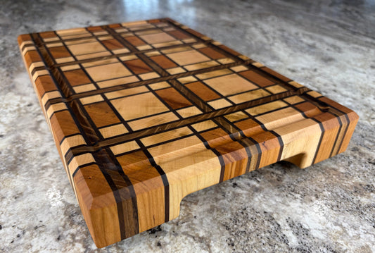 CHERRY AND MAPLE, WALNUT AND RED ELM STRIPS, PLAID END GRAIN BOARD
