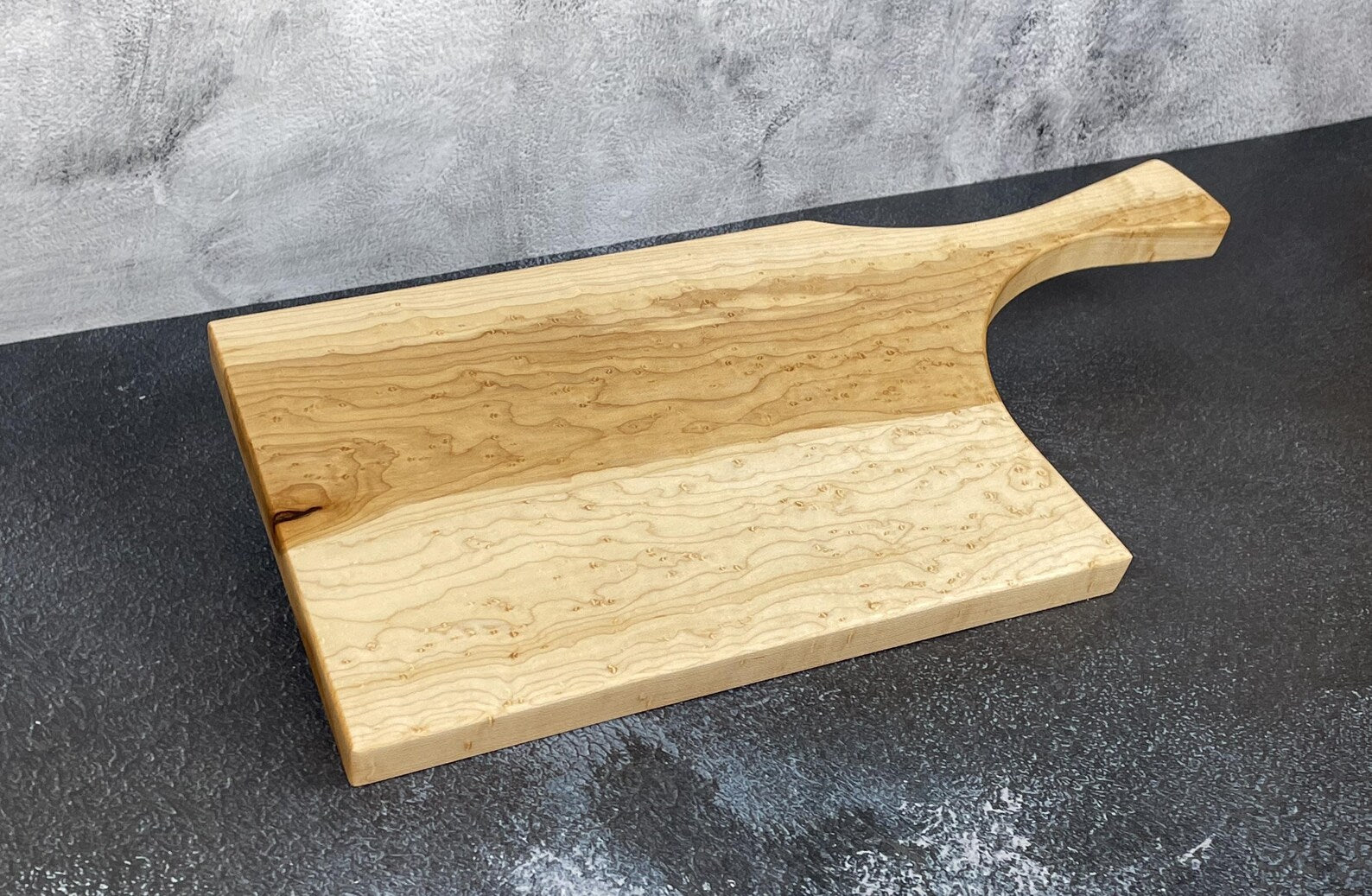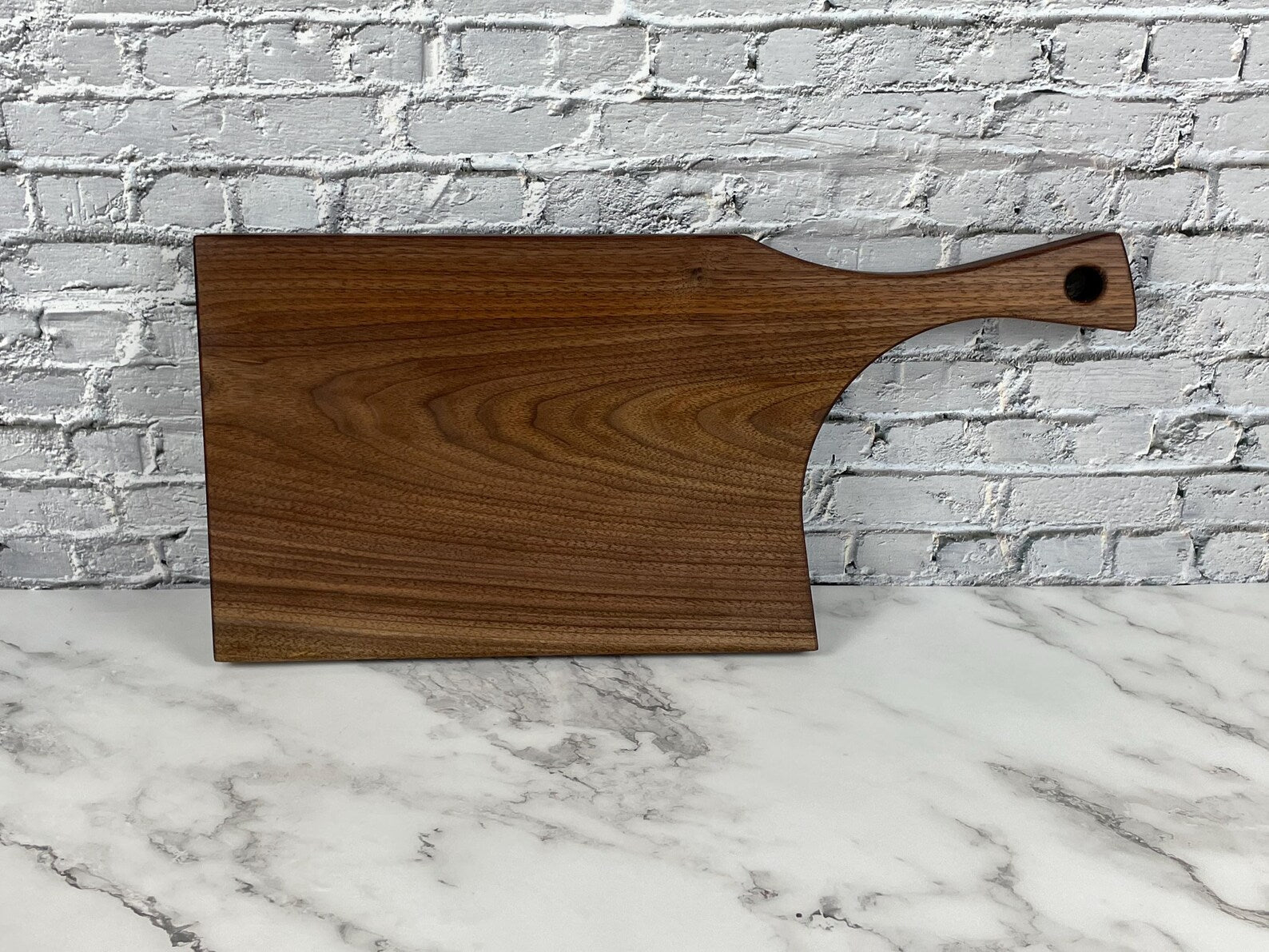 Our solid cutting boards are handcrafted from premium-selected Walnut, Cherry, or Maple hardwoods. Each piece is thoughtfully crafted with care and attention to detail, resulting in a beautiful, durable board designed to serve you for years to come. Hand-finished with a food-safe finish to highlight the wood’s natural beauty and provide lasting protection. Size is 8" x 11" x 7/8+/-, 17" long including handle.