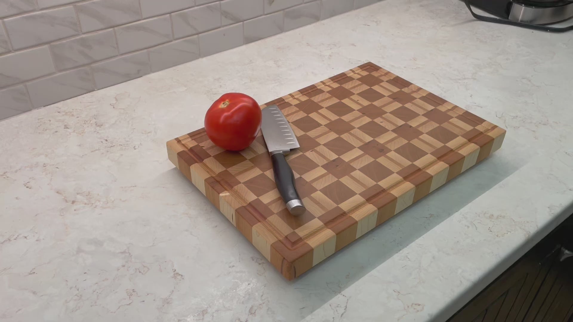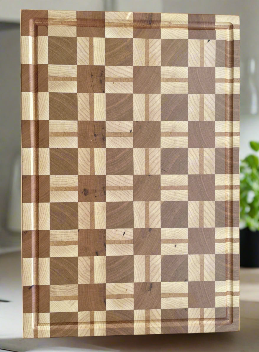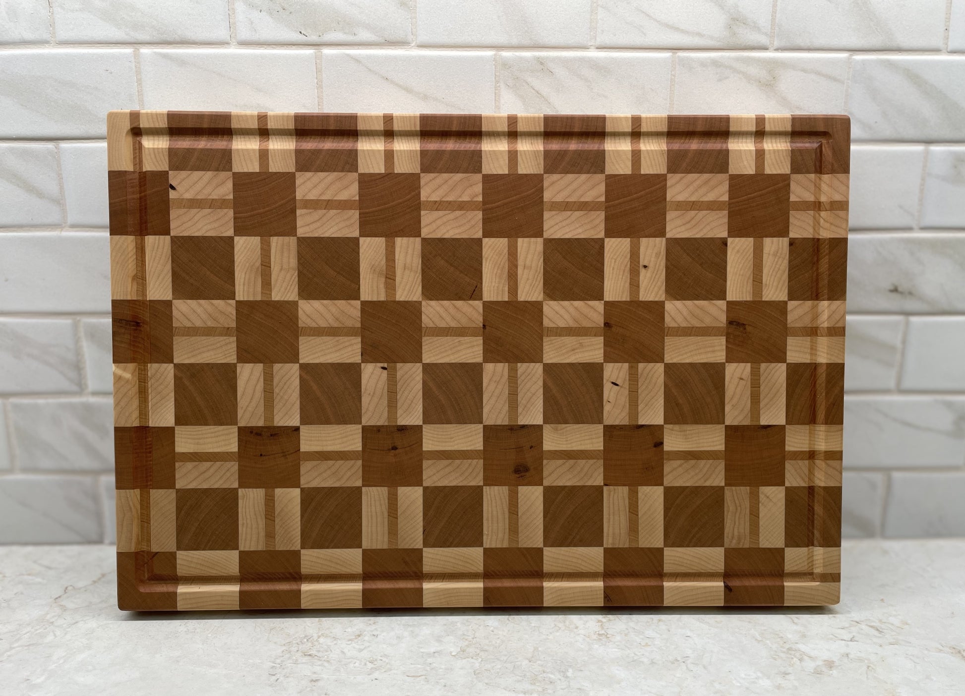 Our Checkerboard Cutting Board is a timeless piece featuring the classic contrast of Maple and Cherry—two woods that complement each other beautifully. This popular combination creates a harmonious look, even as the Cherry darkens over time to a rich, natural red.