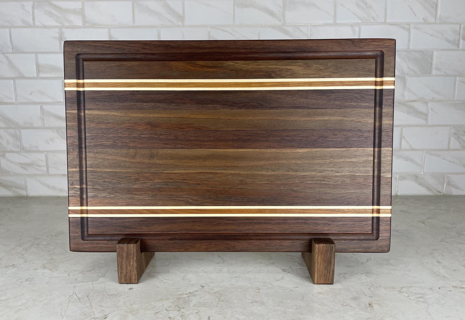 Our walnut cutting board with Cherry & Maple Accent Strips is a beautiful and functional kitchen piece. The rich, dark colour of the walnut pairs wonderfully with the light, creamy tones of maple. The staggered accent strips give the board a unique, visually interesting pattern, which can add an elegant touch to your kitchen.