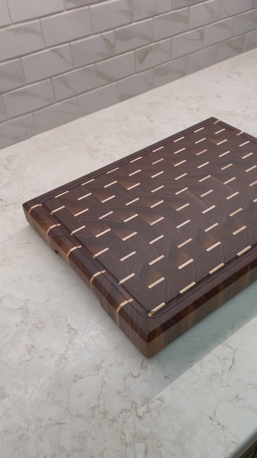 Crafted from solid walnut, this cutting board features a rich, deep hue that’s beautifully enhanced by a finish of mineral oil and beeswax. The subtle maple accent strips, just 1/8" wide, make a striking contrast, adding a bold yet refined touch.