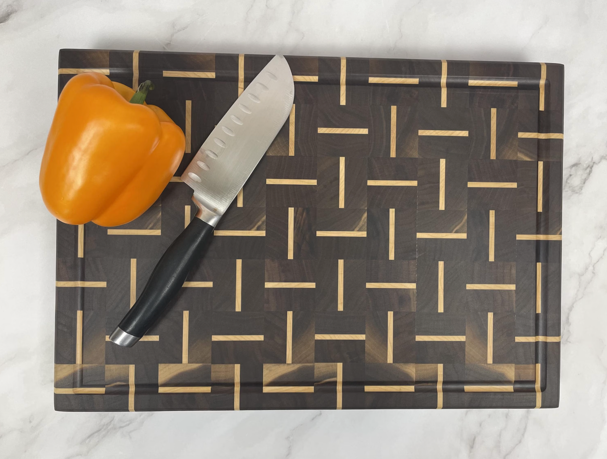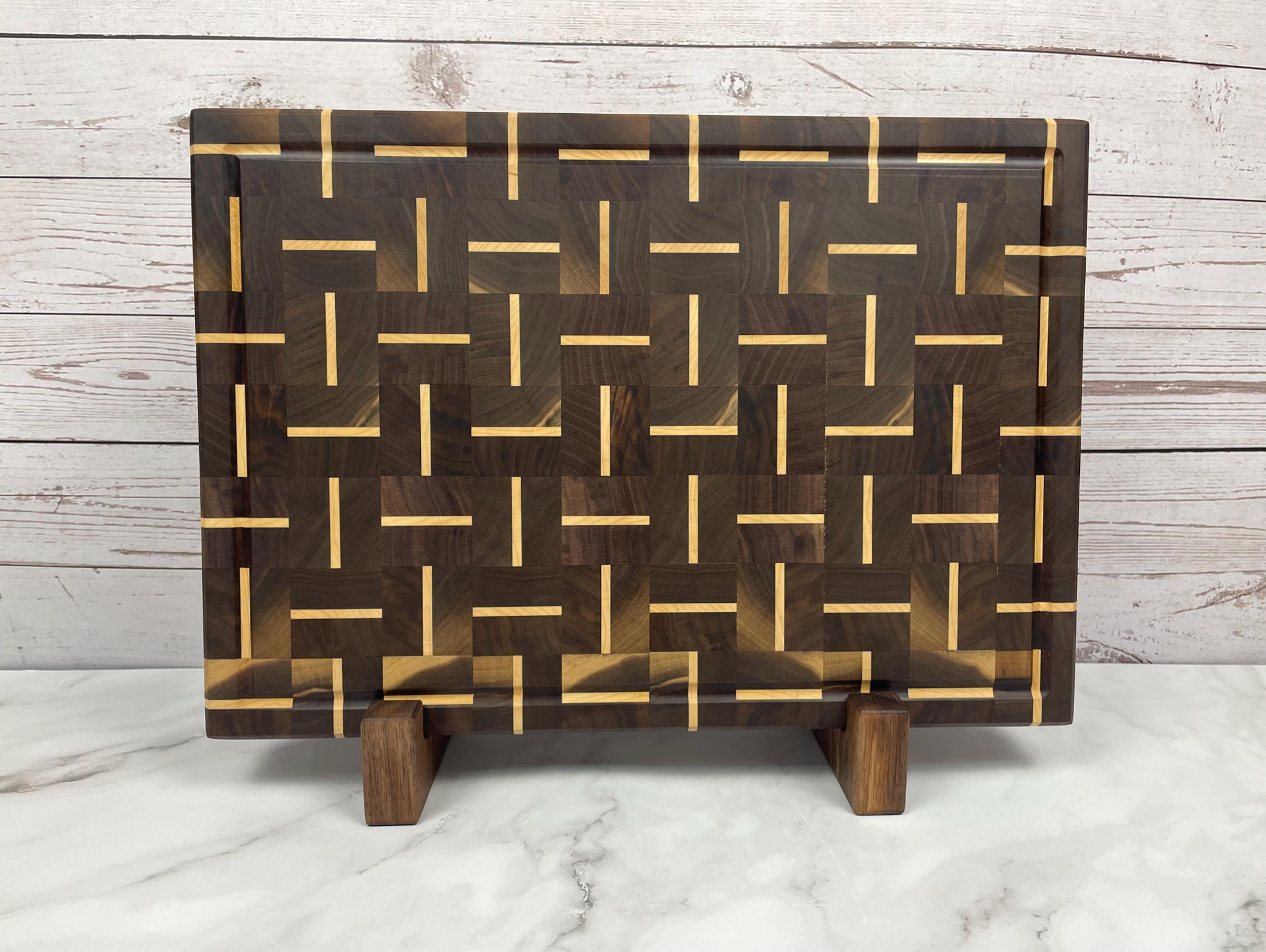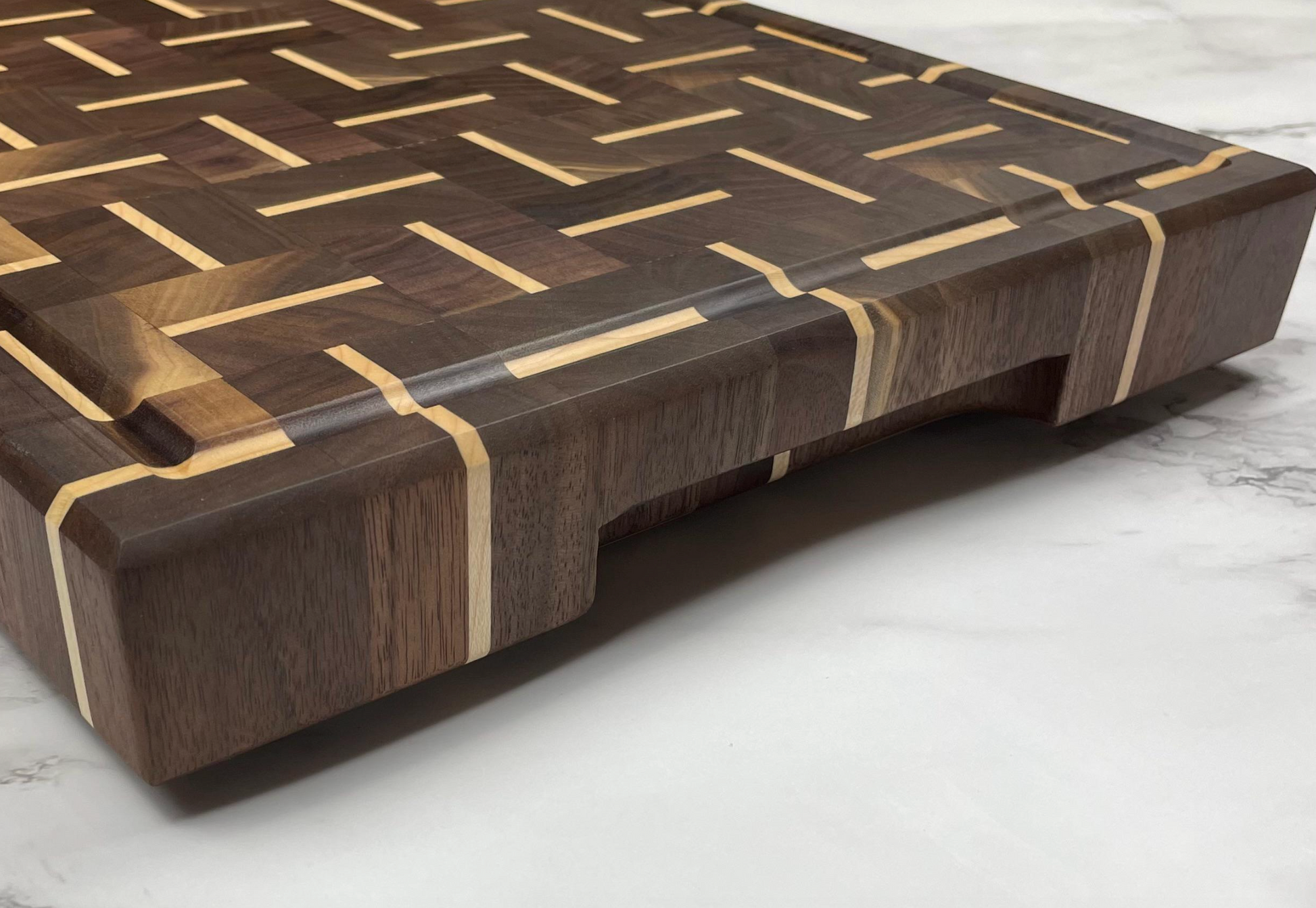 The combination of walnut and maple provides both durability and a nice contrast in terms of color and grain. These cutting boards are handcrafted, with the different woods joined together using precise woodwork techniques such as edge-gluing. The added feature of the End Grain cutting board is how with the grain standing up on end it actually separates when the knife is in use and comes back together which in turn allows the edge of the knife to stay sharper longer.